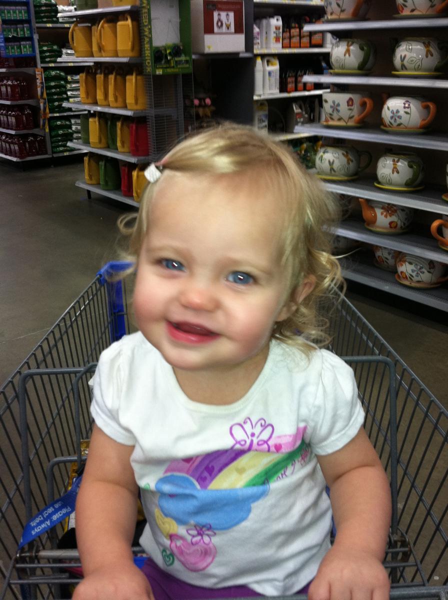 I confess that my sister is only the third person to ever drive Stella anywhere and it happened last night. Ha, 18 months later. And I think we were both nervous. But she did good. Stella went to WalMart with Aunt Lacie and Not Uncle Phil. I warned Lacie that Stella is in that oh so fun, "I don't wana sit in the cart" stage. And guess what the little stink but did? Sat in the car the whole time!! I get this picture on my phone while they were there: